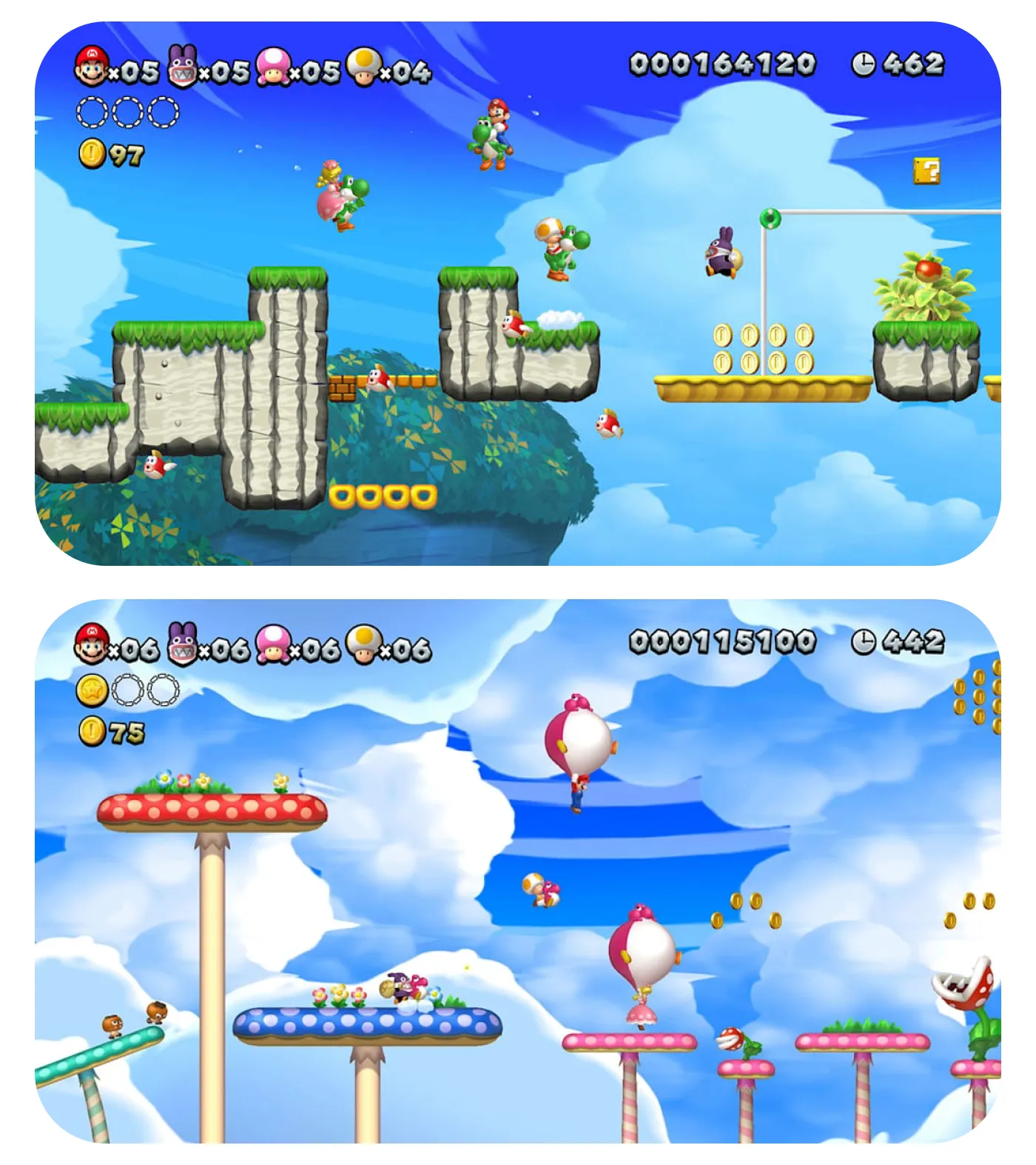 A jogabilidade combina controles simples e intuitivos com níveis criativos, permitindo que até quatro jogadores joguem juntos em modo cooperativo local. O título inclui personagens jogáveis como Mario, Luigi, Toad, Toadette e Nabbit, cada um com atributos que podem influenciar a forma de jogar, tornando o jogo ideal tanto para iniciantes quanto para quem busca desafios mais intensos. Ao todo, o pacote oferece mais de 160 fases, além de modos adicionais como Boost Rush, desafios e Coin Battle, que aumentam a rejogabilidade e variam a experiência do jogador.
