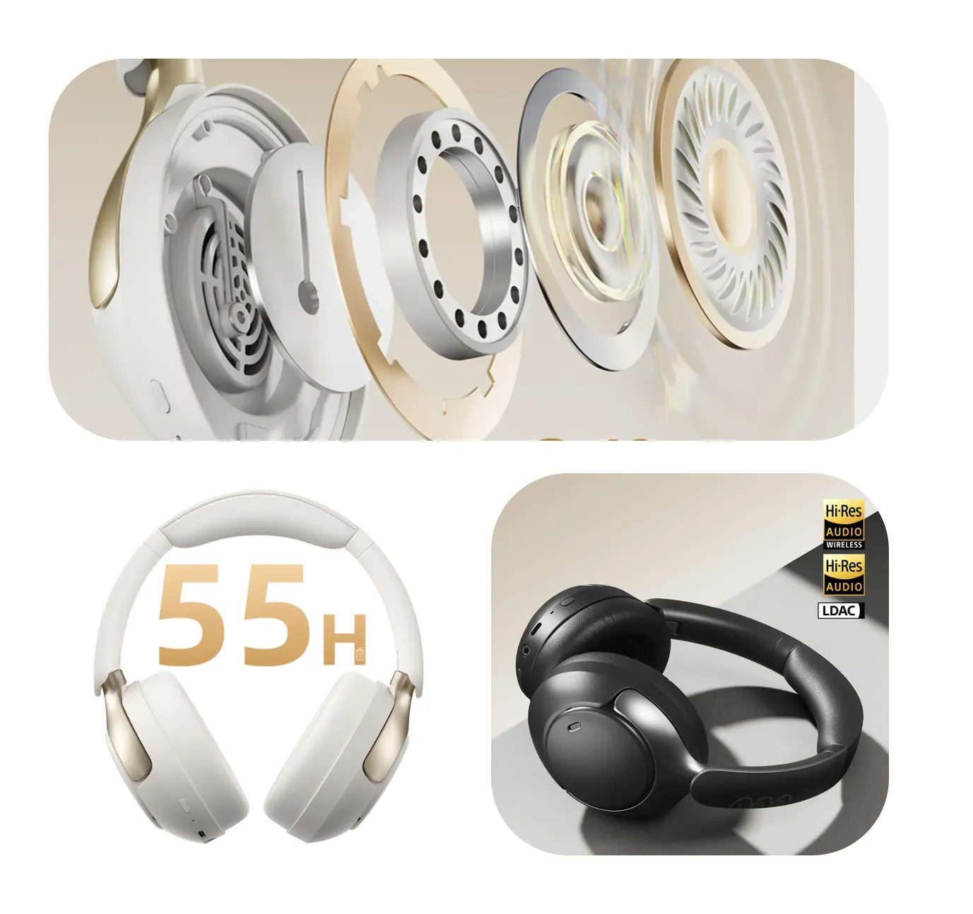 Os QCY H3 Pro contam com drivers dinâmicos de 40 mm com diafragmas revestidos em titânio, que proporcionam um som rico e detalhado, equilibrando graves profundos e agudos nítidos. A compatibilidade com codec LDAC e certificação Hi-Res Audio garante transmissão de áudio de alta resolução via Bluetooth, resultando em uma experiência sonora mais envolvente e clara.