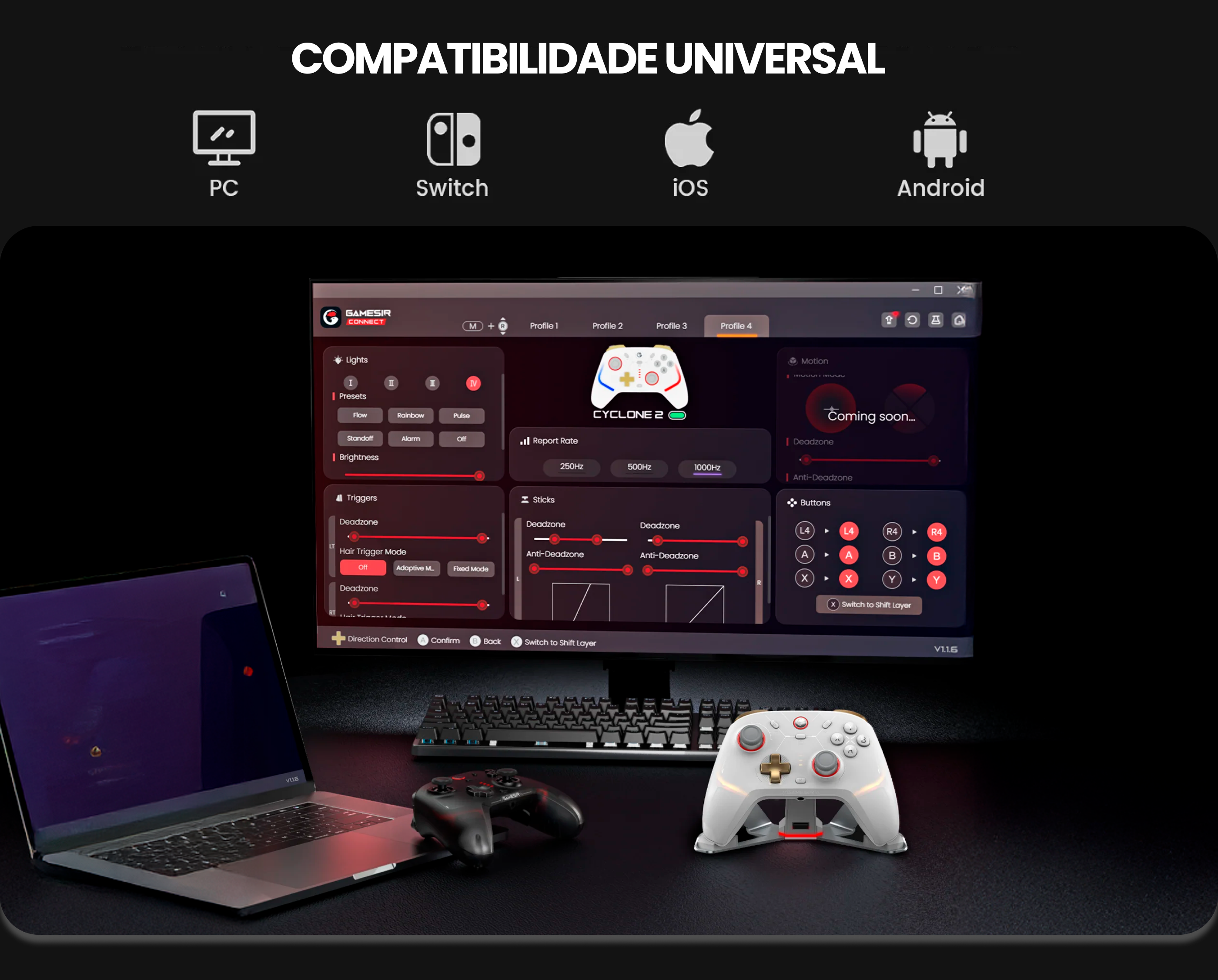Inclui controle por movimento, vibração realista, botões de nível e-sports, troca rápida de perfis e iluminação RGB personalizável, oferecendo uma experiência de jogo completa e adaptável.
