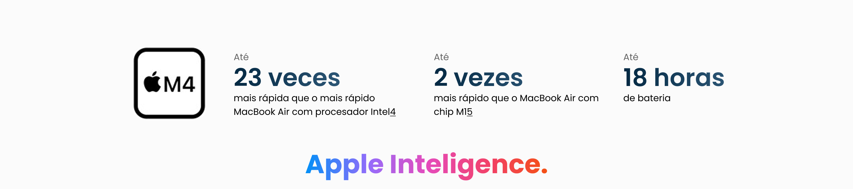 O MacBook Air com chip M4 oferece a velocidade que você precisa para voar em tudo o que faz. Conta com uma bateria que dura até 18 horas². Foi projetado para o Apple Intelligence, que ajuda você a fazer de tudo com muito mais facilidade¹. Agora em uma belíssima cor azul-céu. E como é superportátil, acompanha você aonde for — sempre pronto para encarar qualquer desafio.