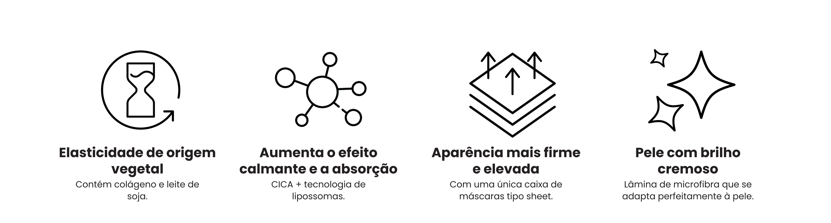 Colágeno vegano e leite de soja, combinados com nove complexos de peptídeos, nutrem profundamente a pele, promovendo elasticidade e firmeza.