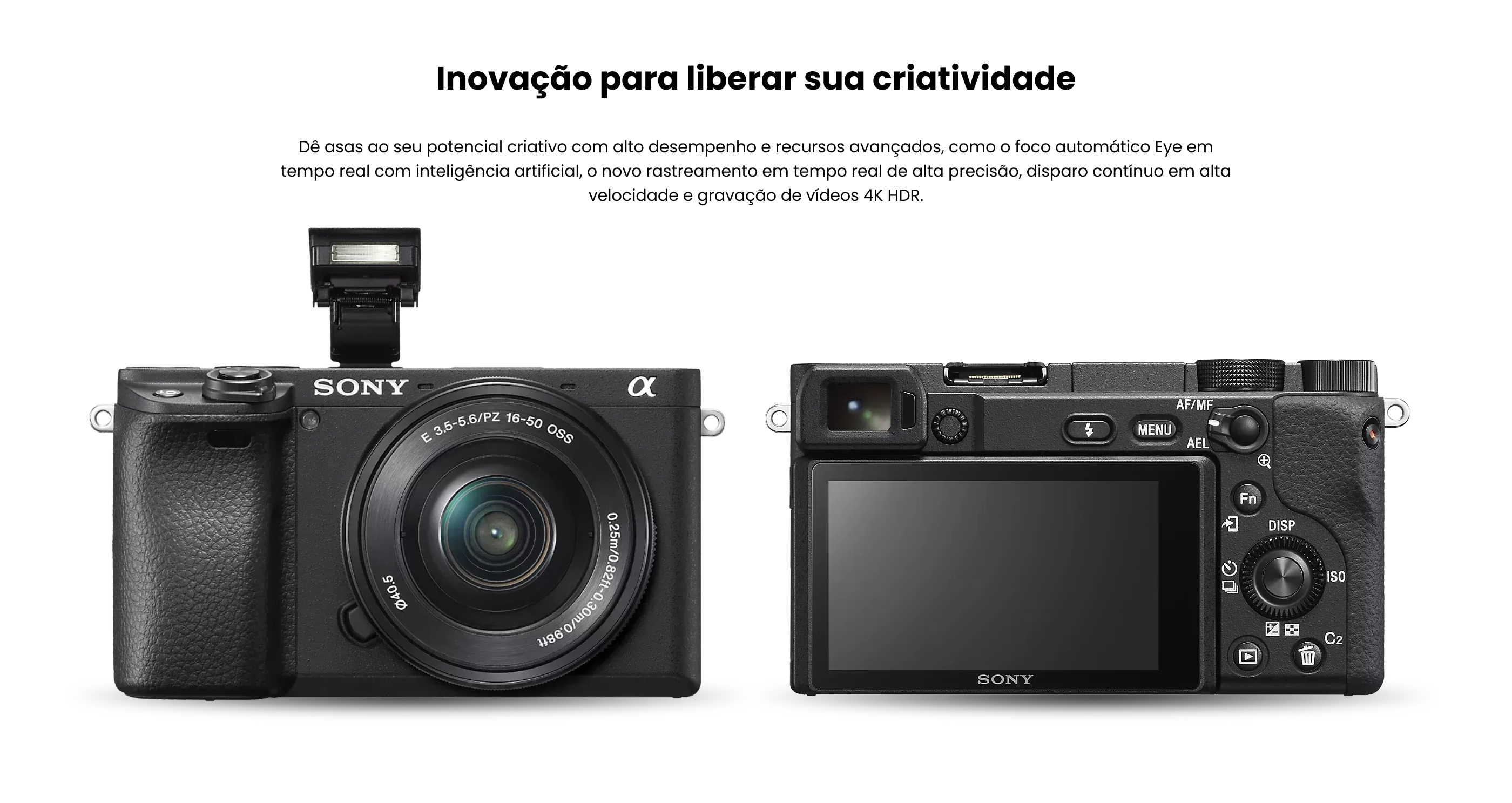 A câmera Sony 6400 ILCE-6400AK une inovação e desempenho para fotógrafos que buscam qualidade superior. Com sensor CMOS Exmor™ APS-C, entrega imagens nítidas e detalhadas. A tela LCD touch screen de 3.0” facilita o enquadramento e o controle, enquanto Wi-Fi, Bluetooth e NFC garantem conectividade avançada. Possui entrada para microfone e fone de ouvido, além de bateria duradoura, sendo perfeita para fotografia e gravação de vídeos em alto nível.