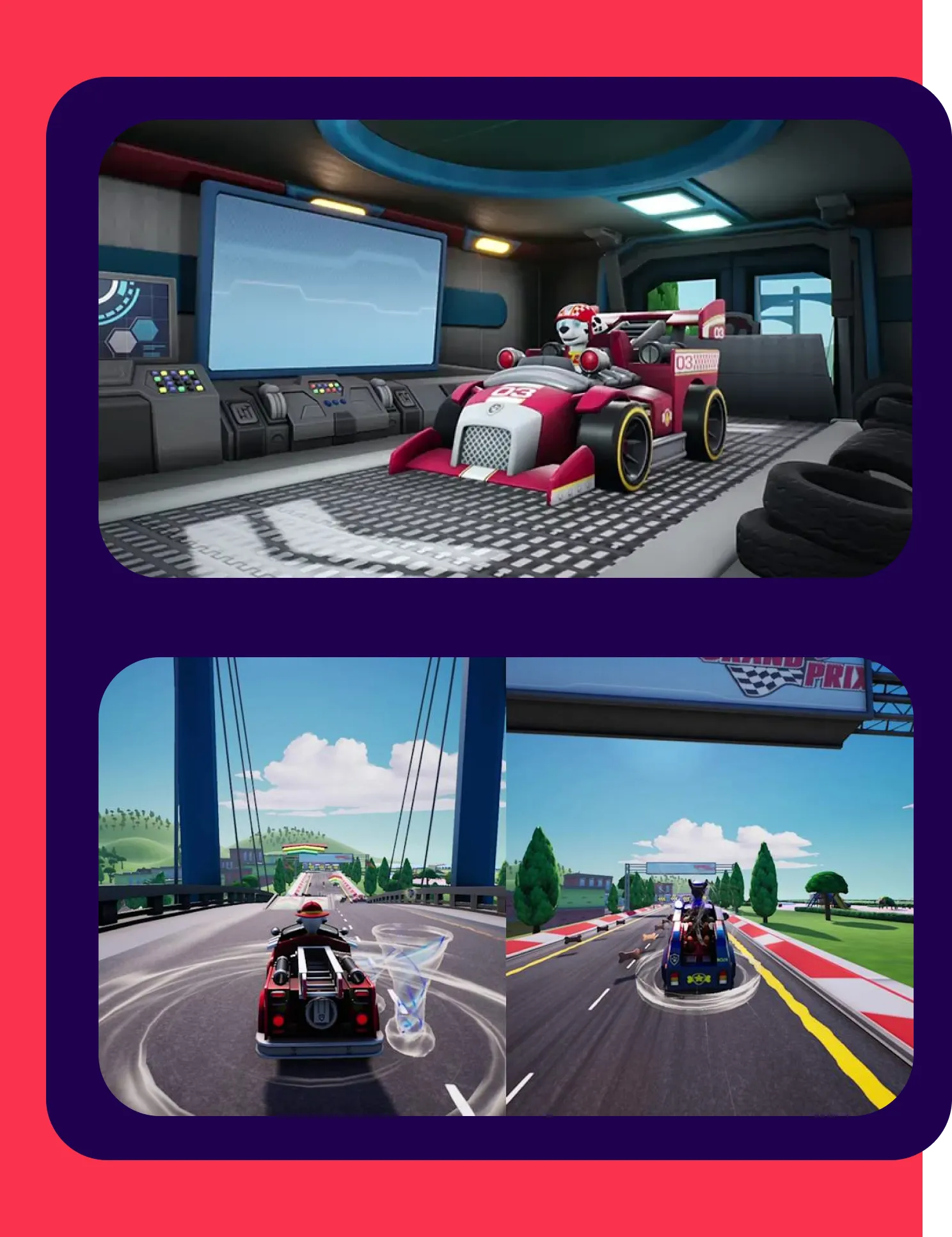 PAW Patrol: Grand Prix é um jogo de corrida de karts para Nintendo Switch, inspirado na popular série infantil PAW Patrol. Desenvolvido por 3DClouds e publicado pela Outright Games, o título foi lançado em 30 de setembro de 2022 e combina diversão acessível com jogabilidade cooperativa e competitiva para todas as idades.