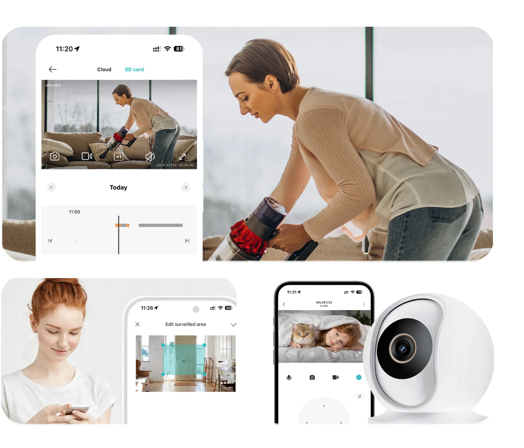 Mesmo em ambientes com pouca luz, a IMILAB C22 garante vigilância eficaz com visão noturna automática, proporcionando imagens claras mesmo no escuro. O armazenamento é flexível, suportando cartão MicroSD (até 512GB) e opções de nuvem quando disponíveis, facilitando guardar e acessar registros. O controle ocorre diretamente pelo aplicativo intuitivo, permitindo visualizar feeds ao vivo, ajustar configurações e acessar gravações a qualquer momento pelo smartphone.