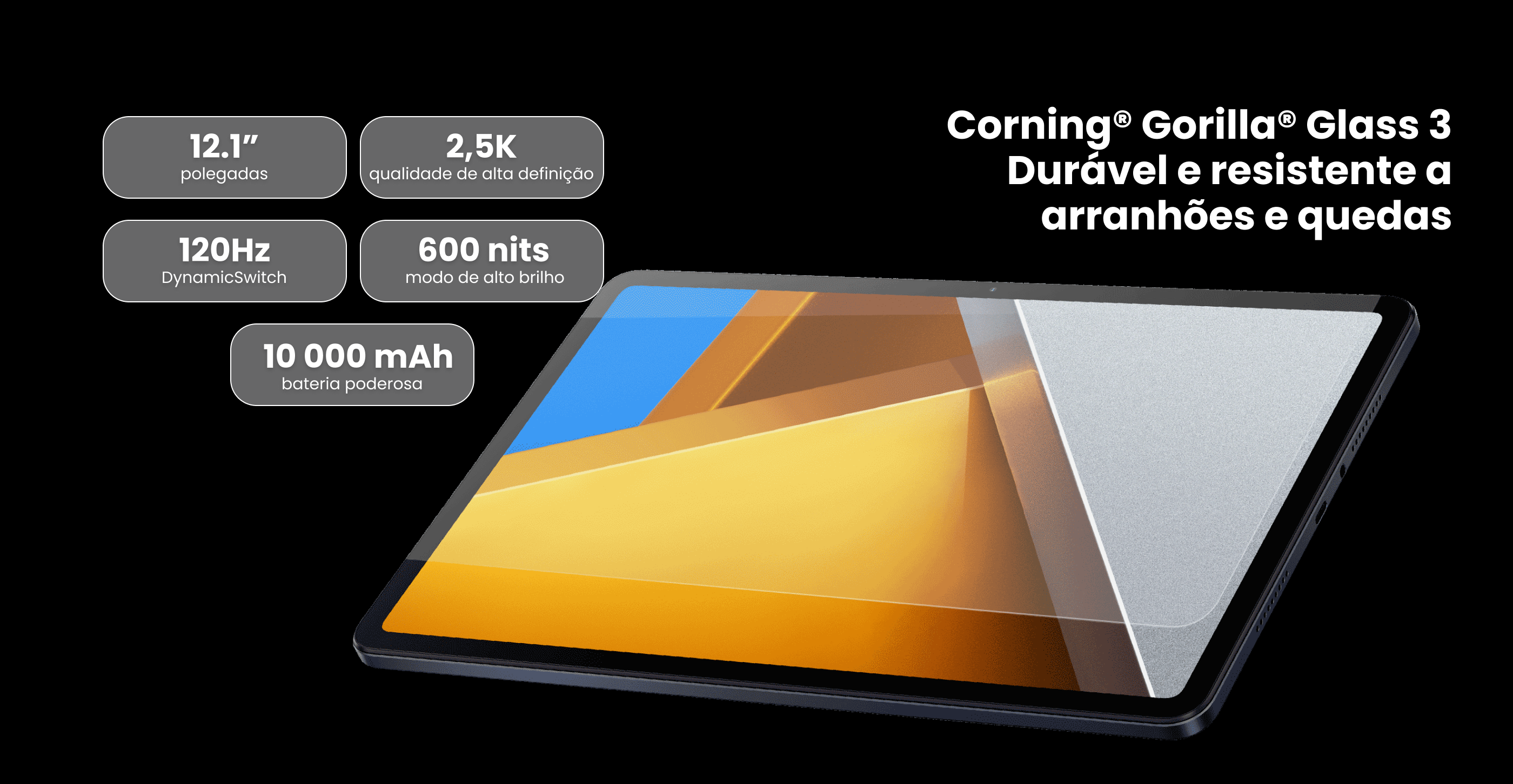 LCD de 12.1" 2.5K, Tecnologia Dolby Vision e proteção Corning Gorilla Glass 3