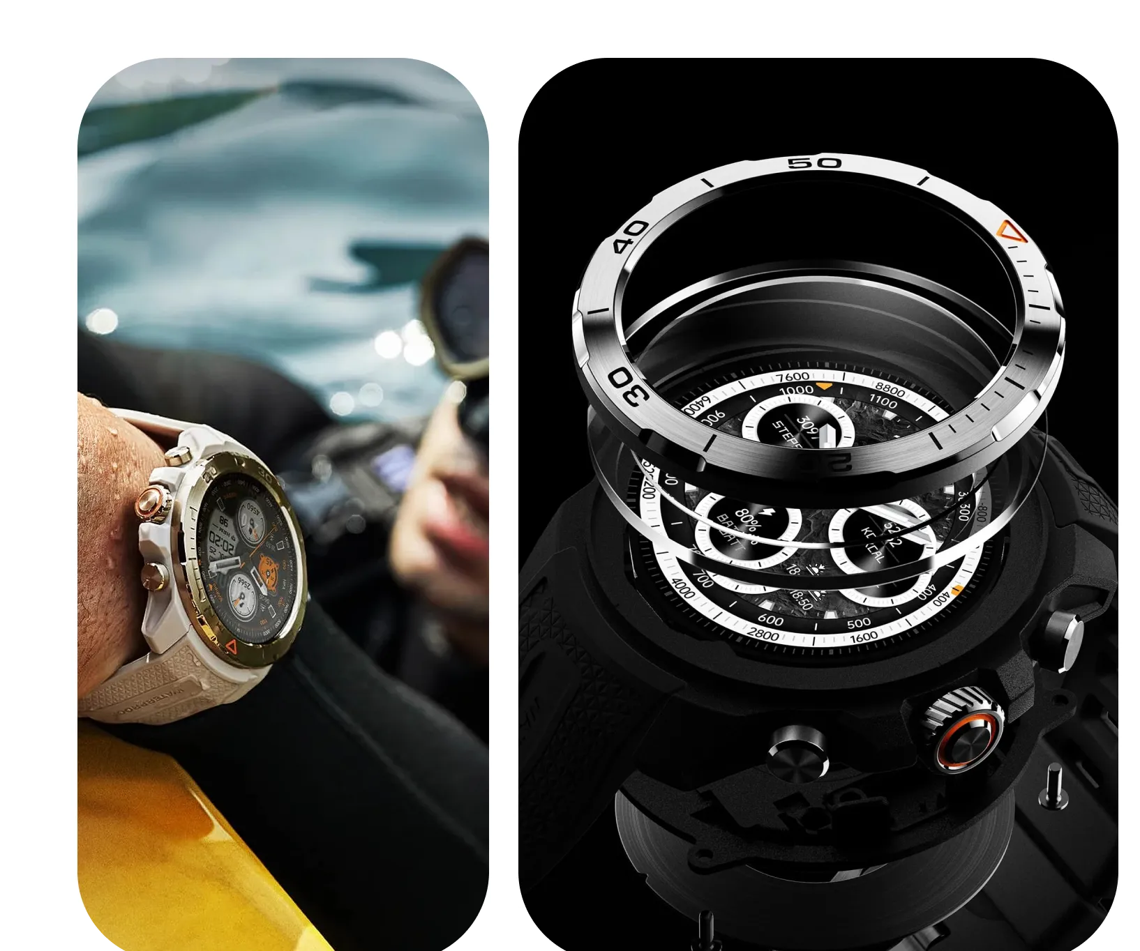 O GS Explorer apresenta uma tela AMOLED de 1,32 polegadas com brilho de até 1500 nits, garantindo excelente visibilidade sob luz intensa, inclusive ao ar livre. O design combina aço inoxidável 316L com nylon reforçado por fibra, vidro Corning® Gorilla® e certificação de resistência de nível militar, oferecendo robustez contra impactos, poeira e temperaturas extremas.