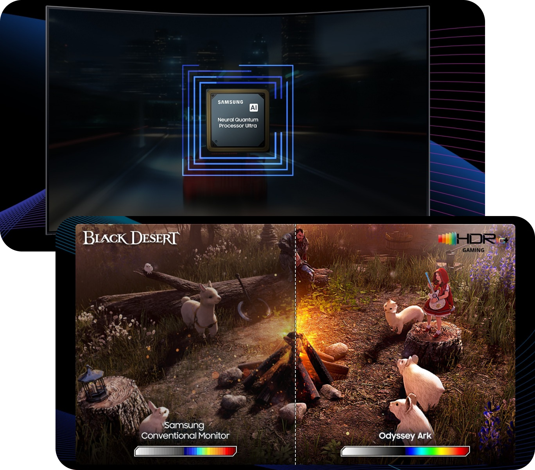 Abra um novo caminho rumo à glória. O modo Cockpit oferece uma nova visão com uma tela de 55" com curvatura de 1000R, enquanto a iluminação Quantum Mini-LED proporciona detalhes vibrantes.
