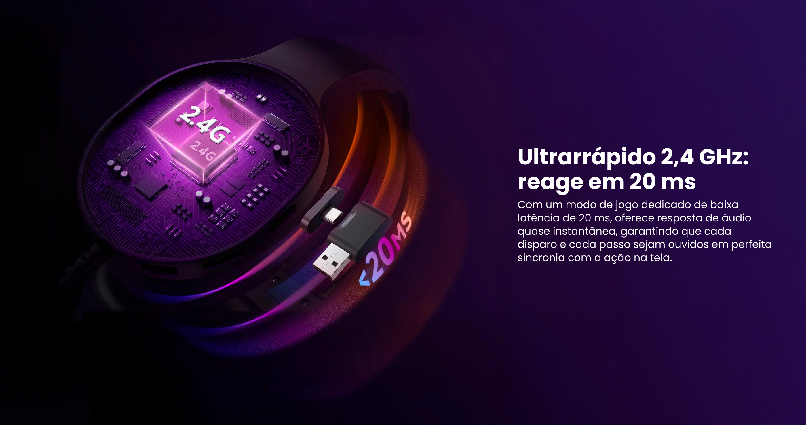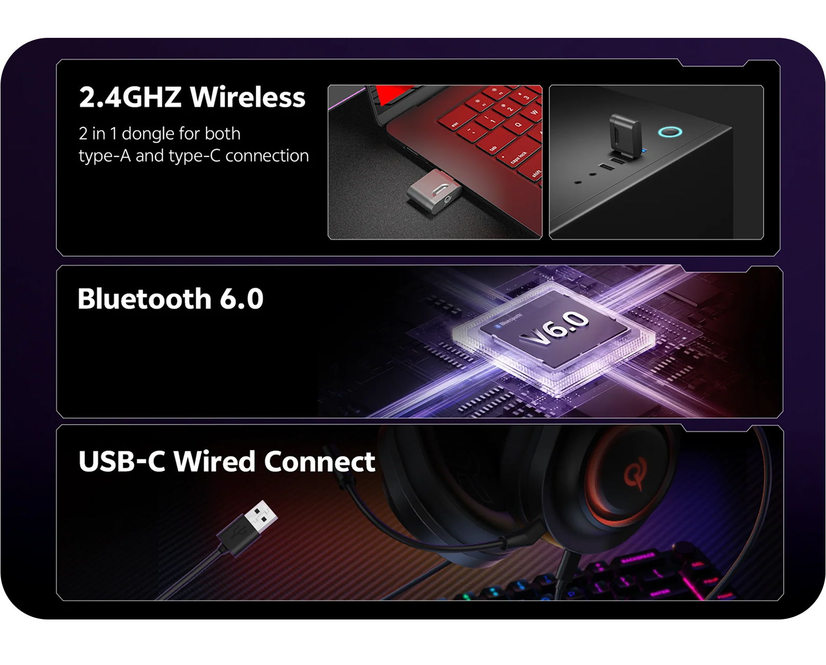 Alterne facilmente entre a ultrabaixa latência 2,4G (dongle A+C), a mobilidade do Bluetooth 6.0 e a confiabilidade da conexão com fio via Aux, para todos os dispositivos e cenários.