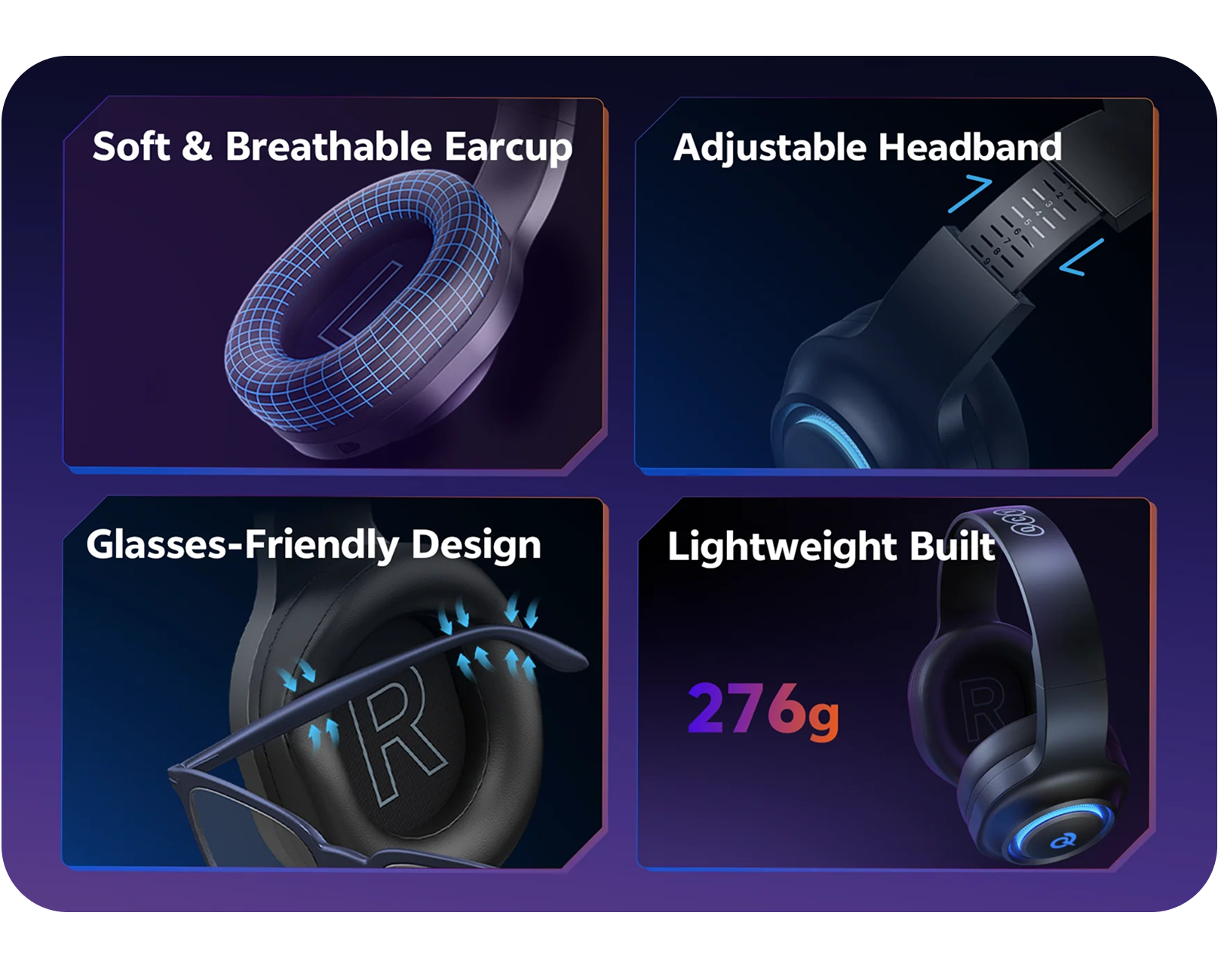Projetado para sessões prolongadas de jogos, com almofadas auriculares respiráveis e macias, haste ajustável e peso ultraleve de 276 g, garantindo imersão sem fadiga.