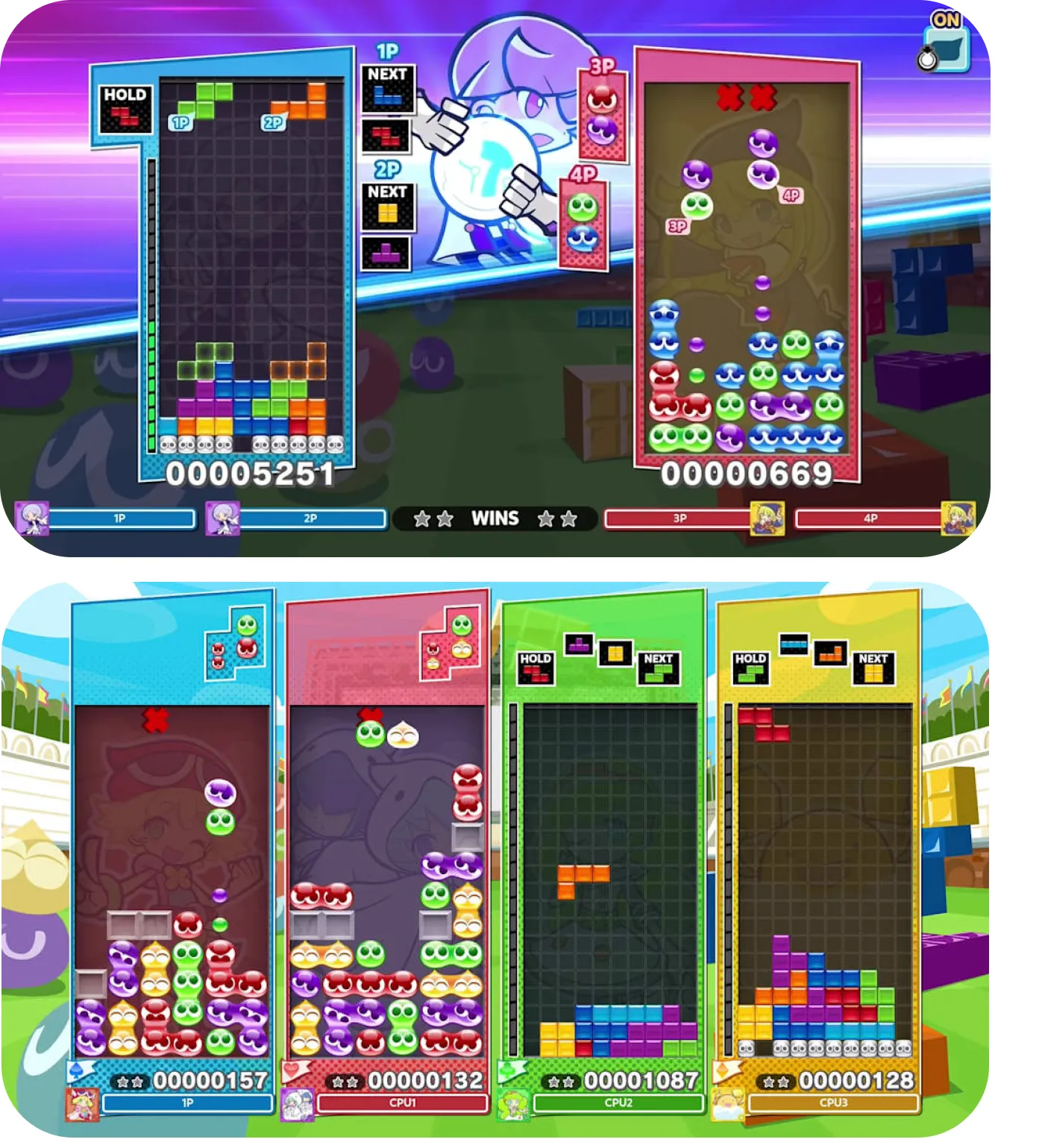 Além dos modos tradicionais de Puyo Puyo Tetris, esta edição introduz o novo modo Puyo Tetris Doubles, onde duas duplas competem em um único tabuleiro cooperando e coordenando jogadas para superar os adversários. Também há suporte para até 4 jogadores no modo local e online, oferecendo opções tanto competitivas quanto cooperativas. O jogo inclui modos como Versus, Puzzle League, Lessons para aprendizado, e desafios que exploram tanto habilidades individuais quanto cooperação em equipe.